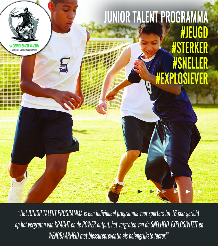 Het Junior Talent Programma is een individueel programma voor sporters tot 16 jaar gericht op het vergroten van KRACHT en de POWER output, het vergroten van de SNELHEID, EXPLOSIVITEIT en WENDBAARHEID. Efficiënter leren bewegen is van groot belang. Daarnaast is er aandacht voor de lineaire en laterale snelheidsontwikkeling inclusief de voetsnelheid met BLESSUREPREVENTIE als belangrijkste factor ... // Meer informatie
